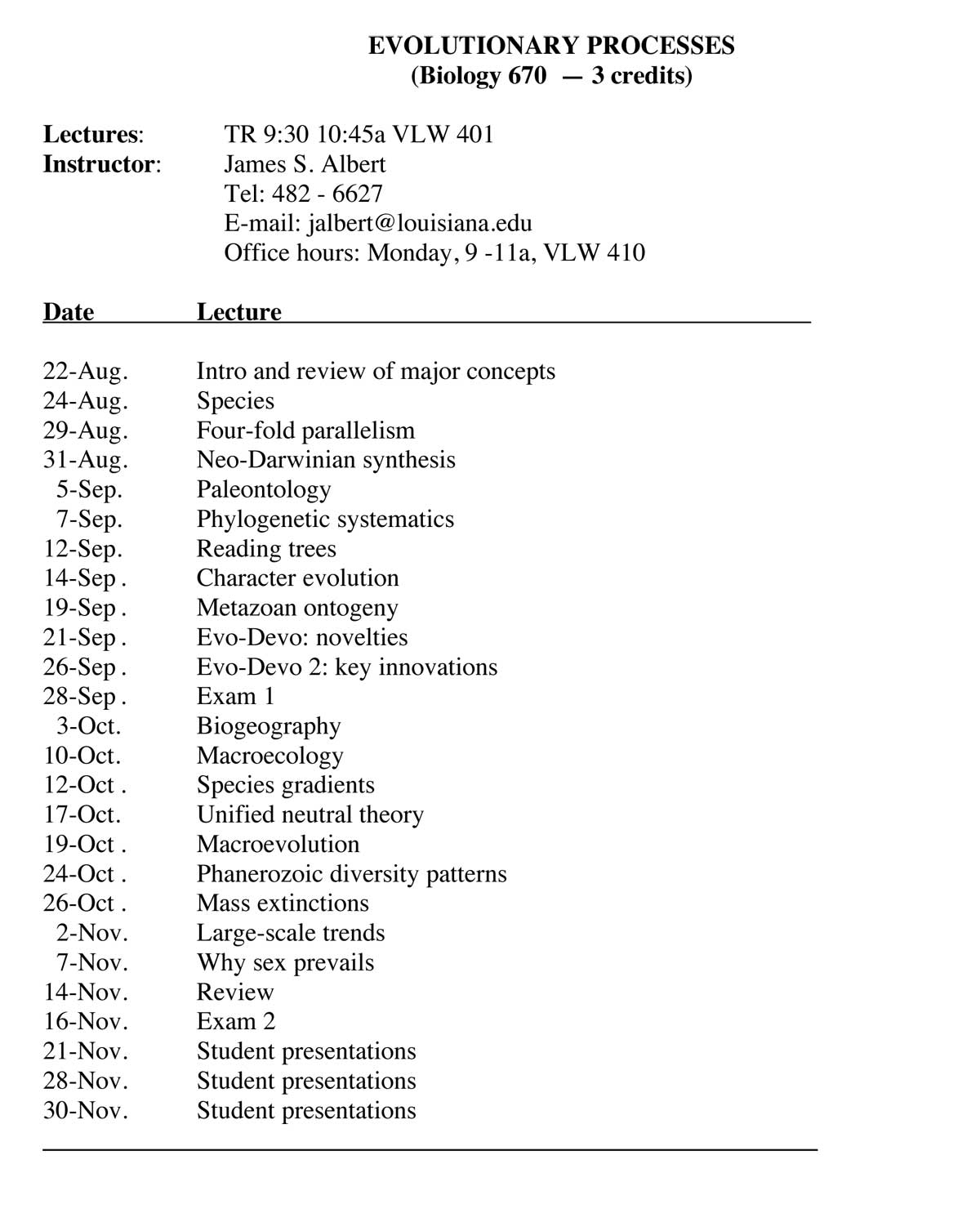 Course Description: Comparative biologists have long been interested in the phenomena of major evolutionary changes, macroevolution, in terms of increased complexity, new structures and body plans, and new lineages. Recent technological advances in genomics (e.g. whole genome sampling) and bioinformatics (the ability to store and "crunch" huge data sets) allow us to gain new insights into the developmental and genetic bases of macroevolutionary changes. Objectives: In this class we will explore how macroevolutionary hypotheses are tested through a variety of approaches from the fields of paleontology, geology, development, systematics, ecology and biogeography. This course will give graduate students a broad background in modern macroevolutionary theory with an emphasis on patterns and processes of biodiversification at and above the species level and evolutionary phenomena at large spatial and temporal scales. Topics to be covered will include, but not limited to, speciation, extinction, character evolution, historical biogeography, evolutionary trends, origins of complexity, Phanerozoic diversity patterns, patterns of species richness, and the unified neutral theory of biodiversity and biogeography. |