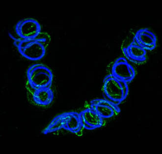 ... is stained by immuno-cytolocalization and imaged by confocal microscopy.