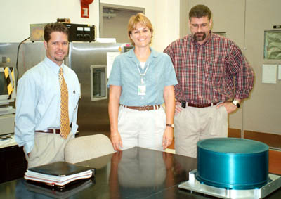 ![]() The KSC support team that helped with design, engineering, and logistics. (L-R) David Cox, April Boody and Ken Anderson. Not shown: software engineer Don Platt. |