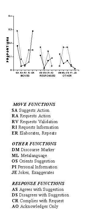 Analyses of variance revealed a significant interaction of function type with discourse modality in all categories of function, F (4,120) = 24.1, p < .001 for MOVES; F (3,90) = 20.2, p < .001 for RESPONSES; F (4,120) = 22.9, p < .001 for OTHER. Subsequent tests of simple effects of modality type at each function indicated that all were significantly different in the two conditions except Requests Validation, Disagrees, and the two affective categories, Requests/Offers Personal Information and Jokes-Exaggerates.