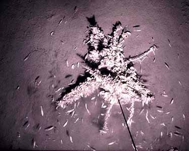Amphipods (Hirondellea gigas) swarm over mackerel, deployed as bait, stripping away the flesh down to bone, at 9605 meters depth in the Philippine Trench. For more on my work in this system, see France, 1993. (Photo courtesy of Robert Hessler, SIO) |