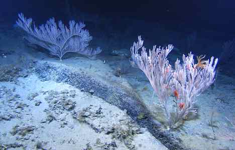 Primnoid octocorals aligned atop a small ridge at 1430 meters depth on Manning Seamount. (Image copyright of the Mountains in the Sea Research Team; IFE; and NOAA) |
