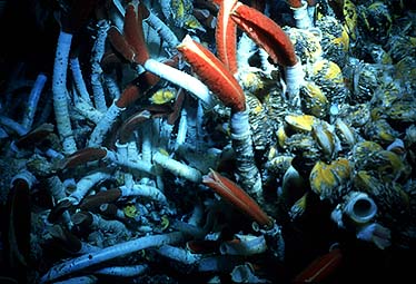 Vestimentiferan tube worms (Riftia pachyptila) and mussels (Bathymodiolus thermopolis) at 2470 meters depth in the Rose Garden hydrothermal vent, Galapagos Rift. For more on my work in this system, see France et al., 1992. (Photo courtesy of Robert Hessler, SIO) |